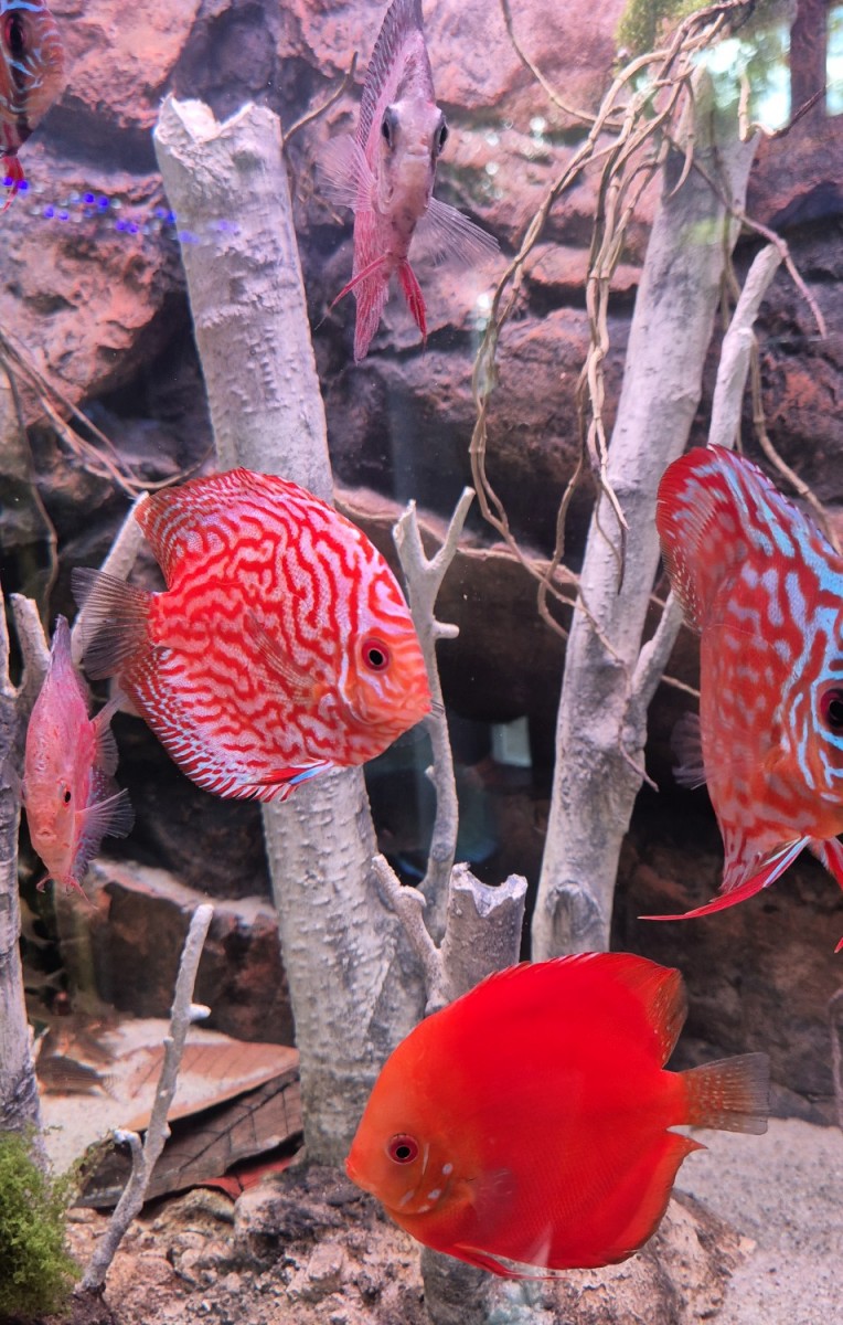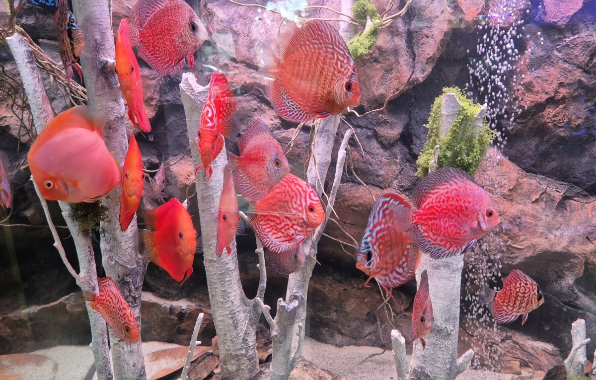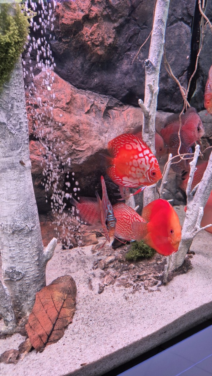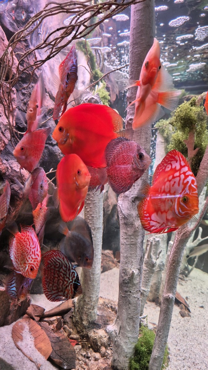 350 literes diszkoszos akvárium, szilikon háttérrel, egyedi fagyökerekkel