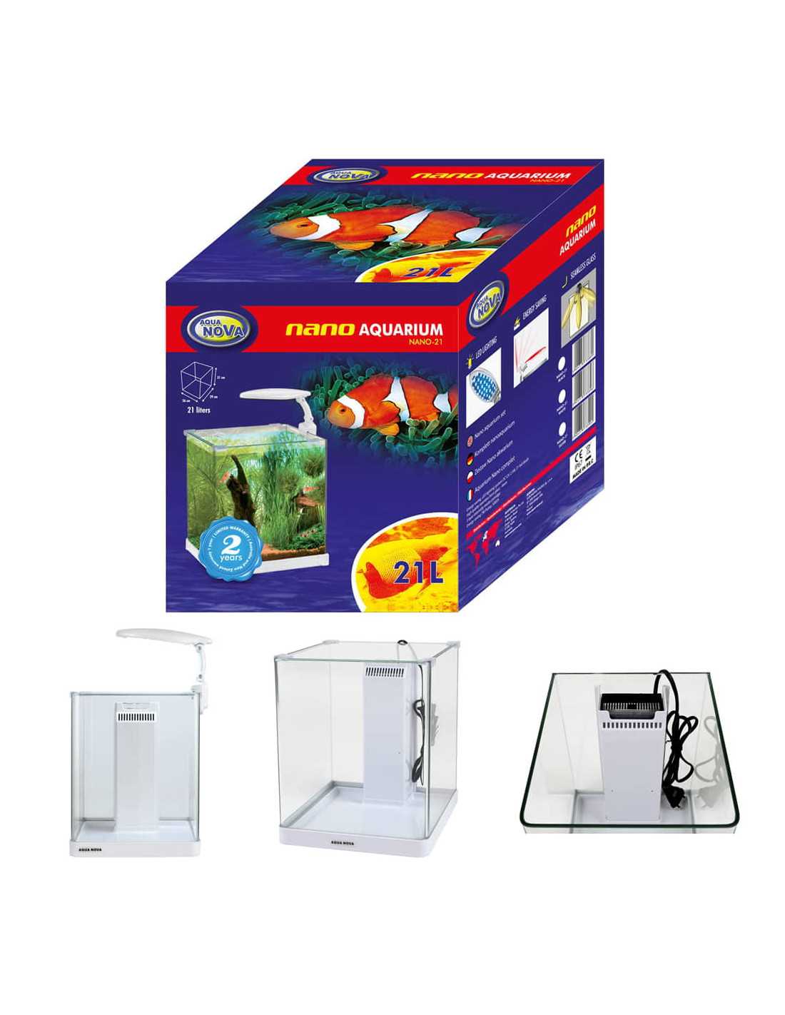 Mutatós, kocka alakú akvárium hajlított elülső sarkokkal. Rögzített alsó kerete elegáns, és általa nem kell külön alátétről gondoskodni az akváriumhoz. A beépített belső szűrő praktikus kazettás szűrőbetétjével könnyen tisztítható. Teljes értékű mechanikai és biológiai szűrést biztosít, a víz csobogtatása által pedig oxigénnel is dúsítja azt. Csíptethető LED lámpája jól illik az akvárium stílusához, és ideális fényviszonyokat teremt benne. Ráadásul energiatakarékos (2,5W) és biztonságos (12V). Esztétikus üveg fedőlap zárja le az akvárium tetejét műanyag akasztók segítségével.
