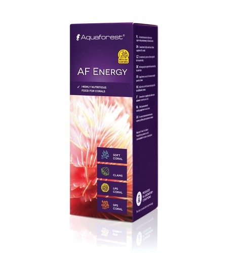 Segíti a korallok fejlődését. Omega-3 és omega-6 zsírsavakat, magas tápanyagértékű koralleleséget tartlamaz. Válogatott zooplankton, aminosavak, vitaminok és karbohidrátok kivonata. Nem tartalmaz nitrátot és foszfátot. Kis mennyiségű rezet tartalmaz, melyre minimális mennyiségben szüksége van a koralloknak. Az AF Energy csökkenti a zooxanthellák mennyiségét, hozzájárulva ezzek az SPS korallok ragyogó színezetéhez.