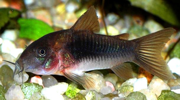 * Tudományos név : Corydoras aeneus * Magyar név: Kékpajzsos páncélosharcsa * Csoport: Harcsák * Származás: Bolívia. Venezuela. * Testhossz: 5-7 cm * Természetes élőhely: Sekély, gyenge sodrású vizek. * Viselkedés: Társas, rajokban él. A vízfenék közelében úszik. * Táplálkozás: Mindenevő, kedveli a grindal férget, tubifexet. * Szaporítás: Könnyű * Medence: Minimum 80 literes * Halnépesség: 80 literre 6-8 hal * Dekoráció: Éles szemcséktől mentes finom homok, növények, gyökerek. * Hőmérséklet: 21-26°C * pH: 7-7,2. * Keménység: 6,7-11,2NK° Megjegyzés: A Corydoras nemzetség halai csak csoportban szeretnek élni. Mikor ételmaradékok után kutatva a homokban járőröznek, ne higgyék, hogy elégedetlenek, hiszen szükségük van arra a változatos menüre, amit a többi lakó evés közben elejteget. Finom homokkal szórjuk be az akvárium alját, s vigyázzunk, nehogy halaink bajszát valami éles szemcse megsértse. A bajusz alapvetően fontos érzékelő, tapogató és ízlelő szerv. A hímeknek, melyek kisebbek, mint a nőstények, hegyesebb a hát- és a hasúszójuk, mint a nőstényeké. A szaporodásnál meg kell várni, amíg egy pár kiválasztja egymást, s ezután különítsük el őket egy 30 literes medencébe. A hím kergetni kezdi a nőstényt, közben a bajszával meg-megcsapkodja a fejét, majd merőlegesen ráereszkedik. A nőstény ekkor kiengedi, s a hím azonnal megtermékenyíti az ikrákat. Ezután a nőstény a hasi úszójával felragasztgatja az ikrákat a medence üvegfalára. Ha ez megtörtént, távolítsuk el a szülőket a szaporítómedencéből. Az ivadékokat sóféreglárvákkal etessük. LEÍRÁS: Bronzszínű testét két sor zöldeskék fényű csontlemez fedi. A kopoltyúfedő és a pofák, az egymástól függetlenül mozgatható szemek alatt szintén fémeszöldek. A nőstények teltebbek. ELTERJEDÉSI TERÜLET: Tavak, patakok és folyók Dél-Amerika-szerte Trinidadtól a La Plata folyóig. TARTÁS ÉS TENYÉSZTÉS: Gyakran vásárolják az akváriumba "takarítóhal"-ként. Nagyon hasonlít a C. rabautihoz. Leginkább éjjel aktívak, ezért a lámpaoltás előtt fél órával etessük meg őket, de ha ez nem megy, azért napközben is meg fogja találni táplálékát. Ezek a halak nagyon tanulékonyak, nagyon békések és csodálatosan könnyen tarthatóak. Ugyanakkor kevéssé ismert, hogy a Corydorasokon van egy nagyon hegyes horog mindkét szeme alatt, egy a zsírszövetben, egy pedig az első hátúszóban. A hal ezeket arra használja, hogy megvédje magát egy nagyobb hal általi lenyeléstől. Ezért kézzel ne nagyon, vagy csak óvatosan fogjuk meg őket, mert ráadásul a horgok mérgezőek is, mely így bőrirritáló sérüléseket okozhat. Célszerű a halháló használata! Nagyon jó a szaglása és bajuszszálai miatt az ízérzékelése is érzékeny, így felfegyverkezve könnyen megtalálja élelmét a talajban is. Létezik egy színes változat is, de ezzel legyünk óvatosak, mert az uszonyaikba fecskendezett színes festéktől ezek az állatok gyakran hamar megbetegednek és idő előtt el is pusztulnak. EGYÉB NEVEK: Házmesterhal. Syn: Callichthys aeneus, Corydoras macrosteus, Corydoras microps, Corydoras venezuelanus, Hoplosoma aeneum . Eng: Bronze Cory, Catfish, Lightspot corydoras, Bronze catfis. Egyéb köznevei: Kobberpansermalle, Wavy catfish, Kuparimonni, Corydoras bronze, Fouilleur, Goldstreifenpanzerwels, Metall-Panzerwels, Metallpansarmal. Az adatok a diszhal.info honlapról származnak.
