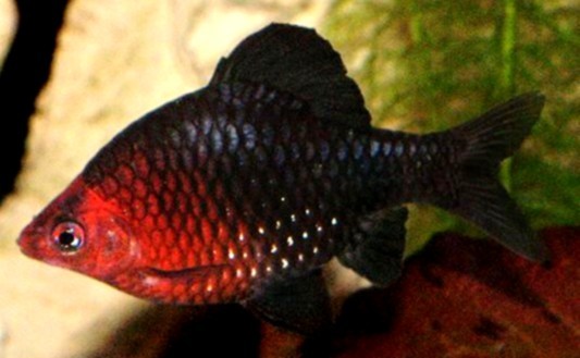 * Tudományos név : Barbus nigrofasciatus * Szinonímák: Puntius nigrofasciatus * Magyar név: Bíborfejű díszmárna * Csoport: Pontyfélék * Származás: Srí Lanka Dél-Nyugati részén * Testhossz: 6 cm * Természetes élőhely: Növényekben gazdag, lassan folyó vizek. * Viselkedés: Mozgékony csapathalak, kissé csipkelődők, hasonló méretű halakkal (díszmárnák, harcsák) tartsuk. * Táplálkozás: Mindenevő, a száraz eleséget is elfogadja. * Szaporítás: Könnyű * Medence: Minimum 60 literes * Halnépesség: 60 literre 6-8 hal; * Dekoráció: Sűrű növényzet, de legyen bőven úszóterük is. Közepes világítás. Sötét aljzat. * Hőmérséklet: 22-26 °C * pH: 6-7 * Keménység: <12NK° Megjegyzés: Mindenképpen csapatban tartsuk őket (több hímet is), mert a hímek színe a rivalizálástól nagyon szépen kijön, ha csak párban tartjuk őket, akkor csak íváskor jönnek elő gyönyörű színei. Ivarérett állatoknál az ivarok könnyen megkülönböztethetők, mivel nem csak formai különbség (dimorfizmus), hanem színbeli különbség (dichromatizmus) is van. A fiatal bíborfejű díszmárnák teste sötét-ezüst színű, 3 fekete függöleges csíkkal. A sötét-ezüst szín sötét bíborba vált, ahogy ivaréretté válnak. A hím úszói sötétszürkék, ívás idején és ha jól érzi magát, szinte koromfeketék. A nostény sokkal halványabb, ugyanakkor harántcsíkjai jobban látszanak. Szaporításhoz emeljük meg a hőmérsékletet 26-28 °C-ra, használjunk lágy, enyhén savas vízet, és tegyünk egy csomó finom levelű vízinövényt a medencébe, ami közé a nőstény az ikrákat szórja. A hím megpróbálja a nőstényt a növények közé hajtani, de ha nőstény vonakodik, a hím elég agresszívvé válhat, ezért a nősténynek szüksége van búvóhelyre. Ha minden jól megy a pár a növények közé ikrázik. Az ikrák száma elérheti a 300-at, és az ivadékok 24 óra múlva kelnek ki. Érdemes ikrarácsot használni, mert a szülők erősen ikrafalók. Ívás után távolítsuk el a szülőket. Gyakran előfordul, hogy az első ívás nem sikeres, ugyan az ivadékok kikelnek, de nem életképesek. 3-4 hét elteltével ha jól tápláljuk a halakat, újra próbálkozhatunk az ívatással, és ilyenkor már általában minden rendben megy. Az apró halak jó étvágyúak, és az első hónapban elérik az 1 cm-es hosszt, és ilyenkor kezdenek színesedni is. Ivadékai lassabban fejlodnek, mint a rózsás díszmárnáké. Az adatok a diszhal.info honlapról származnak.
