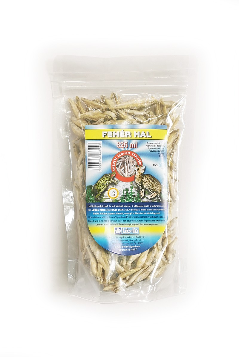 Liofilizált fehér hal teknősök, cicák részére. A feldolgozás során a tápértéke nem változik, így megfelelő táplálék kedvencének. Magas fehérje és kálcium tartalommal. Adagolási javaslat: egyszerre annyit etessen, amennyit a teknős rögtön elfogyaszt. Kerülje az egyoldalú táplálást, más természetes eleség etetése is javasolt!