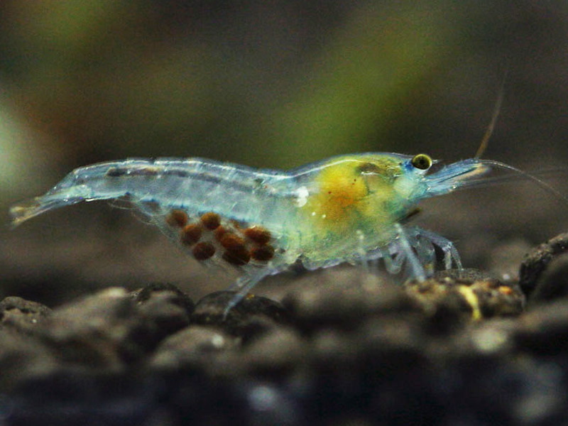 A kék gyöngy a kék színezés érdekében végzett szelektív nemesítés eredménye, amelyet először 2006-ban mutatott be a világnak Ulf Gottschalk német garnélatermesztő. Színét általában jégkéknek írják le, néha vörös árnyalatokkal a test egyes részein. Gottschalk ekkor mutatta be a hógolyó-garnélát is : ugyanannak a garnélának szelektíven tenyésztett fehér változatát.