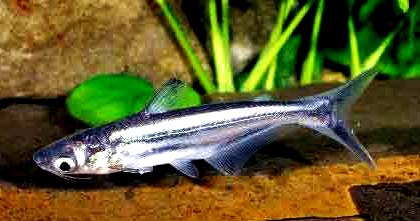 A nemzetségnek megfelelö testalkat. Sötét ezüstszürke, két széles fekete hossz irányú kötödésekkel. Az elsö a fejtöl egyenes vonalban fut a Caudale (farok úszó) bázisáig (alapjáig), a második a fejnél kezdödik, a has felé egy ivet ir, és hátrafelé mindig keskenyebb lesz, majd a végbél úszó hátsó részén végzödik. A has fehéres. Az úszók feketék világos szélekkel. A nemi különbségek ismeretlenek. A gondozásához csakis nagy és tágas tartály/medence a megfelelö. Elegáns, társaságot kedvelö csapathalak, akik egyedül tartva tönkremennek. Vizhömérséklet 20 - 25° C. E`lö eleség. Kemény, kitartó faj, de a megszokási idöszakban zavarások/zaklatásoknál percekig tartó sokk-állapotokkal reagálnak és mintha halottak lennének fekszenek az akváriumban. A napközben aktiv és a teljes egésszében békés természetü harcsák sok úszóteret igényelnek.