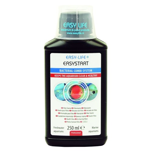 Az Easystart segíti az akvárium és a szűrő gyors indítását. A különleges készítmény meggyorsítja a hasznos baktériumok elszaporodását, segíti a védekezést a káros baktériumokkal szemben, a nehézfém és más kémiai szennyeződésektől megtisztítja a vizet. Az eredmény egy egészséges akvárium, amiben gyönyörű élénk színű halak élnek.
