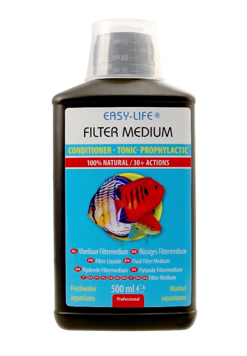 A holland Easy Life FFM (fluid filter medium) terméke több, mint vízelőkészítő: a klór és nehézfémek megkötése mellett olyan más pozitív általános hatásai is vannak, mint a vízminőség javítása, egyéb káros anyagok eltávolítása, a hal-stressz csökkentése, az ivadékok növekedésének elősegítése, stb. Az Easy Life "folyékony szűrőanyag" csak természetes összetevőket tartalmaz. A használatának semmilyen káros hatását nem ismerjük! Hatására az első percekben a víz enyhén opálosodhat. Ez egy természetes folyamat eredménye, és hamar eltűnik.