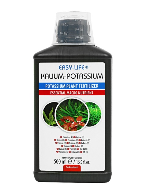 Az Easy Life Potassium (K) egy esszenciális makro tápanyag akváriumi növényekhez, ami legalább annyira fontos mint például a vas. Különösen lágy vizes akváriumokban gyakran fordul elő kálium hiány. Kálium hiány, a legtöbb esetben, a hasonló tünetek miatt, könnyen összekeverhető a vashiánnyal, de a kálium hiány esetén az egész levél sárga, halvány színű már már fehér. Vashiány esetén zöld levelekkel is találkozhatunk.
