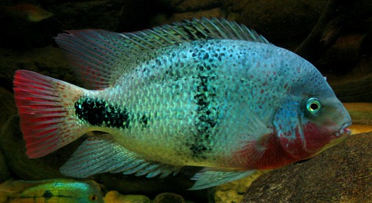 The Black Belt Cichlid, Vieja maculicauda, likes the shady bank areas of lakes and slow-moving rivers, where it can hide among submerged roots and logs and scavenge the muddy or sandy bottom for snacks. Primarily an herbivore, the detritus and seeds it finds there sustain it between larger meals of fallen fruit or submerged terrestrial and aquatic plants. Though it will accep large flakes, pellets, earthworms and mosquito larvae in the aquarium, this fish definitely needs plenty of fresh vegetables, such as peas, lettuce and spinach, in order to thrive. Known to reach eighteen inches in the wild, captive V. maculicauda seldom attain more than twelve inches, and slightly less for females. Both sexes exhibit a whitish-to-gray background coloration, often with a blue sheen. The underside, from throat to lower lip, is generally a deep red color, and a wide, black lateral band at mid-flank gives them their common name. Females are usually darker in color than males, while older males commonly develop a nuchal hump. Like most Central American cichlids, the Black Belt is aggressive, though less so than some. They will almost always display aggression toward smaller fish. A single male may be kept alone in a specimen tank of at least 48-inch length, or with other cichlids of similar or larger size in a tank of at least 100-gallons. Breeding pairs should be kept by themselves in a still-larger tank (preferably 150-gallon or larger), as they become extremely territorial and aggressive when spawning. V. maculicauda is not a fish for a planted tank, as they will eat most any vegetation they can find. Low light is best, as in nature, their preference is for shaded waters. Flat surface spawners, the Black Belt male chooses the spawning site, usually a flat piece of slate or other rock. Both parents clean the site once it's selected, and then a clutch of 500-600 eggs is deposited. Protection reaches its aggressive peak now, which is why the Black Belt needs to be housed alone when spawning. In 2-3 days, the eggs will hatch, and the parents will move their fry to pits they've dug in the substrate. Black Belt Cichlids are excellent parents, so you need have no concern about leaving fry with them even after they've become free-swimming at about 6-7 days. At this stage, you may begin feeding them artemia and other dried foods. Az adatok a diszhal.info honlapról származnak.
