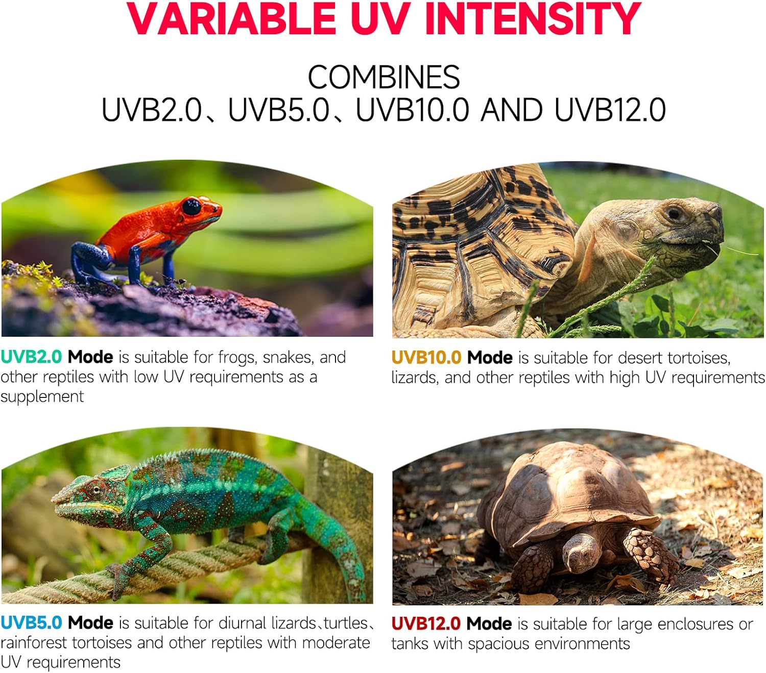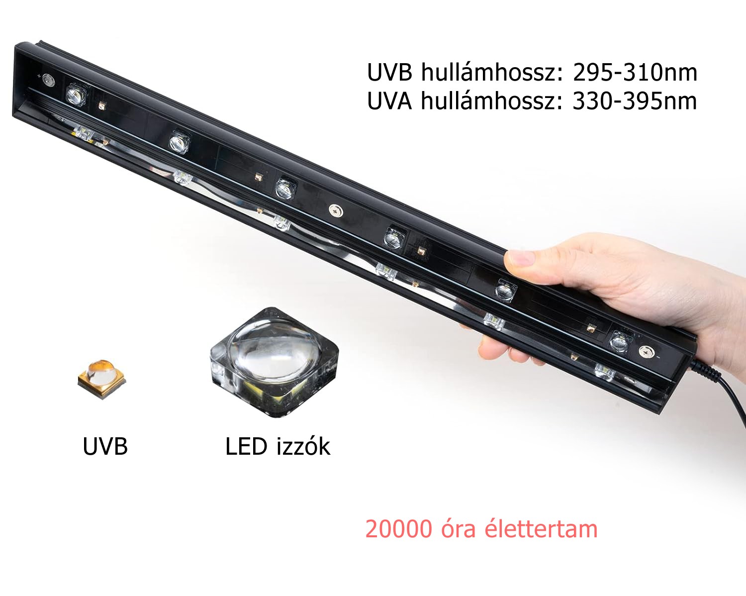 - előre programozott üzemmódok 4-féle: trópusi erdei (2.0 UVB), félsivatagi (5.0 UVB), sivatagi (10.0 UVB), intenzív fényviszonyok (12.0 UVB)