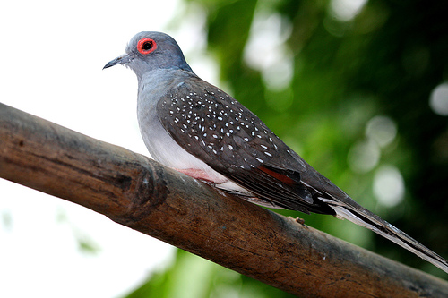 Tollazata is teljesen hétköznapi lenne, ha a balkáni gerléhez hasonlatos szürke alapszínű madárka szárnytollazatán nem helyezkednének el a fehér pettyekből álló gyöngysorok, valamint szeme körül nem lenne az úgynevezett szemgyűrű, amely a hímeknél szélesebb és élénkebb színű. A nemeket küllemük alapján csak erről lehet megkülönböztetni. A gyémántgalamb rendkívül jámbor, csendes jószág. Más madarakkal együtt azért nem ajánlatos tartani, mert még a mellette törpének tekinthető zebrapintyek is képesek megkopasztani és tollait fészekanyagnak felhasználni, ugyanis a gyémántgalamb ellenállás nélkül mindent eltűr.
