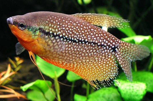 * Tudományos név : Trichogaster leerii * Magyar név: Gyöngygurámi * Csoport: Labirint-kopoltyúsok * Származás: Délkelet-Ázsia. * Testhossz: 12 cm * Természetes élőhely: Árnyas, lassan folydogáló vizek vagy állóvizek. * Viselkedés: Békés, a vízfelszín alatt úszik. * Táplálkozás: Mindenevő * Szaporodás: Elég könnyű. * Medence: Minimum 100 literes * Halnépesség: 120 literre 1 hím és 2 nőstény; * Dekoráció: Tőzeggyökér és sűrű növényzet. * Hőmérséklet: 25-26°C * pH: 6,5-7,5. * Keménység: 5,6-8,4 NK° Megjegyzés: Ezeket a pompás, inkább félénk halakat nem tanácsos túl élénk társakkal összezárni. A hím jól megkülönböztethető a nősténytől, mert felizgatott állapotban a torka körül narancsszínűvé válik. A hátúszója megnyúlt, farok alatti úszója egy sugárral meghosszabbodott, a hasúszók hosszú, vékony tapogatószervvé alakultak. Mindez jellemző a Trichogaster nemzetség többi tagjára is. A szaporodásra készen álló párt egy dús növényzettel beültetett, 120 literes medencébe tanácsos elkülöníteni. A hím elkészíti a finom buborékokból álló habfészket, aztán a fészek alá tereli a nőstényt, ott összeölelkeznek, és forgás közben a hím a nőstény oldalát szorítva szinte kipréseli belőle a gyöngyszínű ikrákat, melyek felemelkednek a víz felszínére. A hím gondosan a habfészekbe gyűjti őket. Az ikrázás után kb. 30 órával az apró ivadékok úgy függeszkednek a habfészek alján, mint a kis vesszők. Mikor elkezdenek úszni, papucsállatkákkal és kerekesférgekkel etethetjük őket. Az egyforma növekedés érdekében ajánlatos az ivadékokat testméret szerint külön-külön medencében elkülönítve nevelni. Az adatok a diszhal.info honlapról származnak.
