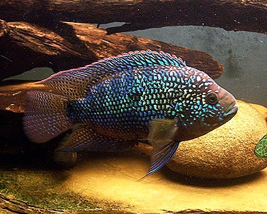 Tartását csak számukra berendezett külön medencében tudjuk ajánlani. Ez az igen mutatós, 2-3 cm nagyságú, ivadékkorban is rendkívül színes, de falánk és gyorsan fejlődő hal, ha nem jóllakott, előbb-utóbb bántja az akvárium többi lakóját. Mindent megeszik, hogy étvágyát csillapítsa. Nem kíméli a növényzetet sem. Mindent átforgat saját tetszése szerint, hogy korai ívásának helyet készítsen. A legerősebb pár rövid időn belül uralkodni kezd nemcsak egy sarok, de az egész akvárium felett. Kezdetben csak üldözi, később azonban szinte szétmarja még fajtestvéreit is. A magára maradt pár könnyen, szívesen ikrázik. Ívóhelyül lapos követ, cserepek belsejét választják ki. Tartásához és tenyésztéséhez kavicsos talajú, növények nélküli, nagy kövekkel, cserepekkel, fatörzsekkel berendezett akvárium a megfelelő. A sok száz ivadék a középkemény, 24 °C-ú vízben a harmadik nap kel ki. További 3-4 nap az elúszás ideje. A szülők igen jó ivadékgondozók, féltve vezetik ivadékaikat hosszabb időn keresztül. Planktoneleséget hatalmas mennyiségben fogyasztanak és már a második héten etethetők, apróra vágott és szűrt Tubifexszel. Hathetes korban már 2 cm nagyságúak. Szépségük az, ami helyet biztosít a faj számára akváriumainkban.