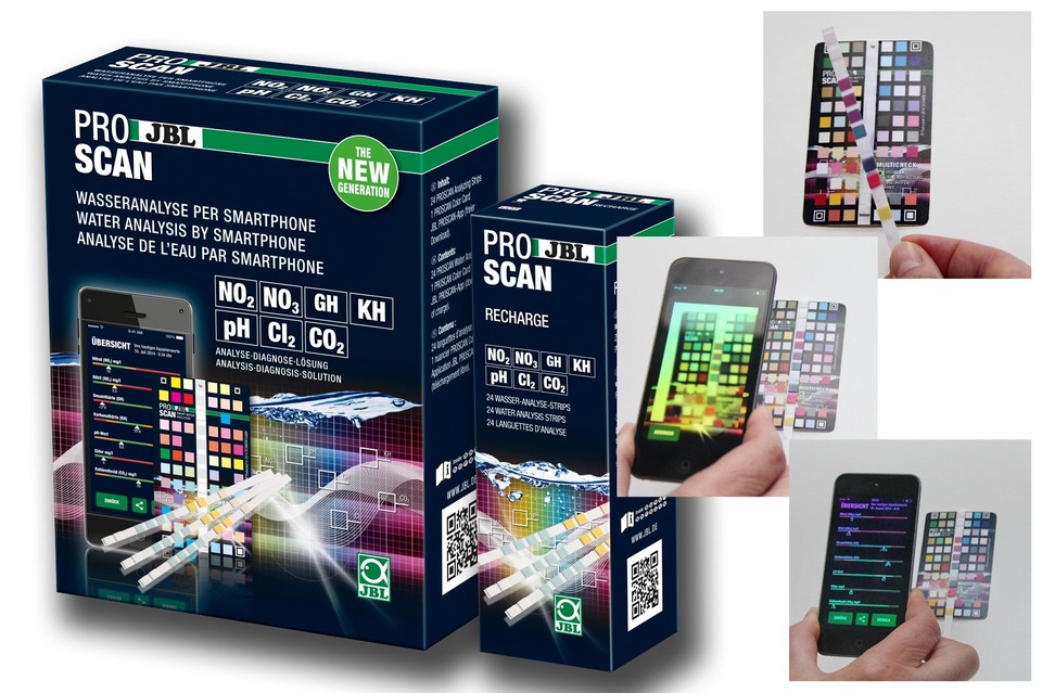 JBL ProScan akváriumi vízteszt okostelefonokhoz – JBL ProScan Teszt egy forradalmian új termék a víz alapvető paramétereinek mérésére az édesvízi akváriumba vagy a kerti tavakba, mely 24 tesztcsíkot tartalmaz, a következő paraméterek teszteléséhez: GH, KH, pH, nitritek, nitrátok, klór és CO2 mérésre (a pH és KH lemért értékek segítségével).