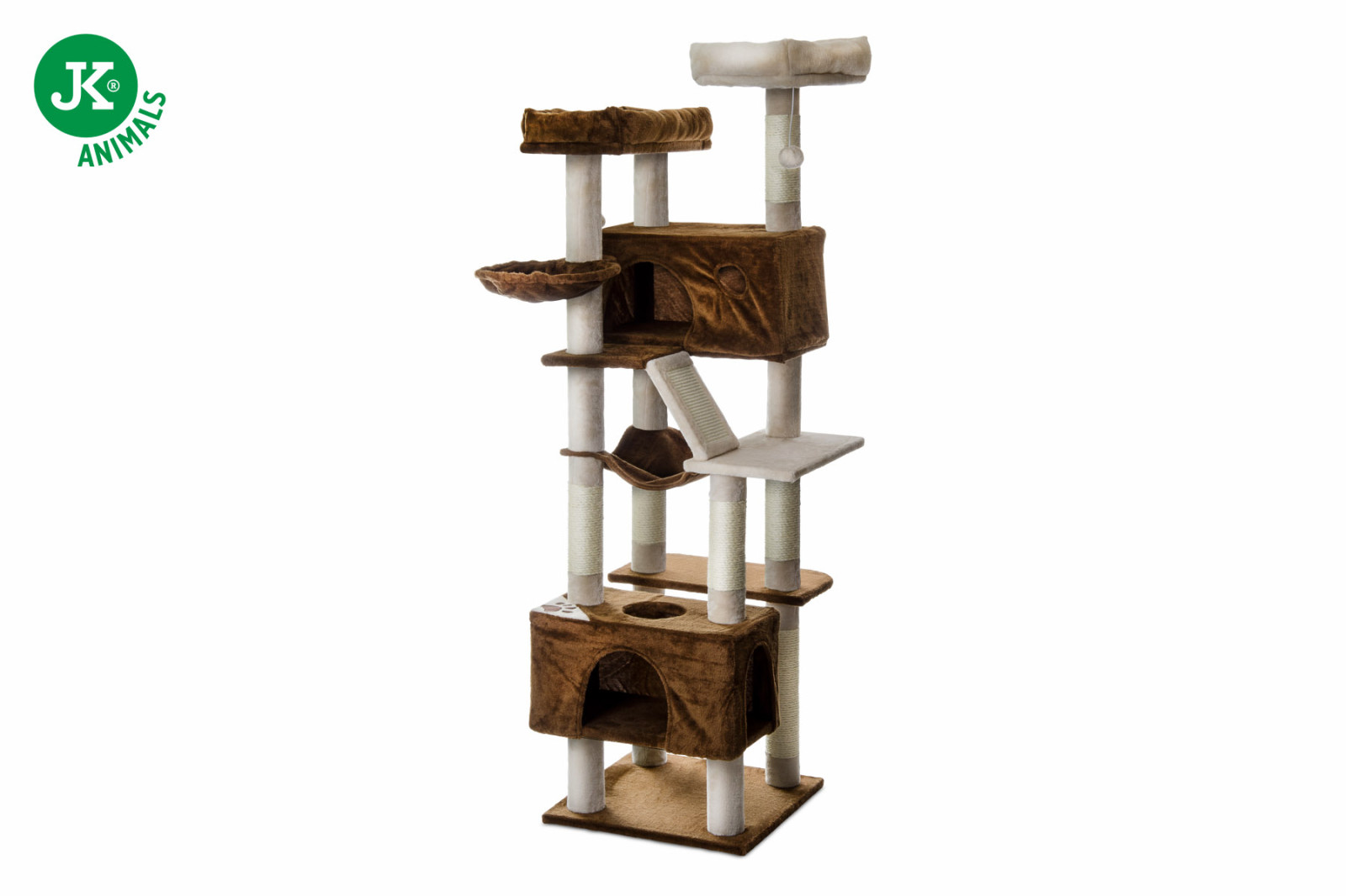 JK Animals KALAHARI extranagy macskabútor egyszerre több macska számára. A magas állvány számos lehetőséget nyújt kiskedvenceinknek a karmolászáshoz, játékhoz és pihenéshez egyaránt. A kaparó oszlopok természetes szizál bevonata nagyon tartós. A plüss borítás kényelmes, kellemes hatású fekhelyeket biztosít. Két doboz alakú odú gondoskodik a diszkrét elvonulás lehetőségéről, és több szinten további teraszok és függőágyak a jó kilátásról és pihenésről, nem beszélve a legfelül elhelyezkedő párnázott fekhelyekről. A felülről lelógó pompom szórakoztatja macskáinkat. Anyaga és színárnyalatai által bármilyen helyiségbe jól illeszkedik.