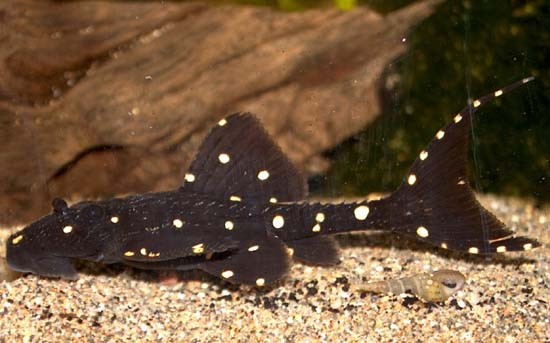 Tudományos név : Acanthicus adonis (Isbrücker, Nijssen; 1988) Szinonímák: L-155 harcsa Magyar név: Fehérpettyes algaevőharcsa Csoport: Harcsák Származás: Dél-Amerika, Brazília és Peru határán Testhossz: 50 cm Természetes élőhely: Eredetileg a Rio Tocantins folyó, de azóta az Amazonas más vizeiből is előkerült. Viselkedés: Békés, de a saját fajtársaival agresszív, ajánlott külön medence számára. Táplálkozás: Növényevő, alga tablettát, forrázott saláta levelet, uborkát adhatunk neki, esetleg élő eleséget. Szaporítás: Akváriumban még nem volt sikeres Medence: Minimum 400 literes Halnépesség: 400 literre 1 hal Dekoráció: Megfelelő méretű búvóhelyek, barlangok. Erős megvilágítás szükséges, a megfelelő alganövekedéshez. A növényeket nem eszik meg, de kitúrhatják, ha útban van nekik. Gyökerek, faágak. Aljzatnak használjunk homokot, vagy apró kavicsot. Hőmérséklet: 23-27 °C pH: 6-7 Keménység: 5-16 NK° Várható életkor: 16 év Megjegyzés: Az Acanthicus adonis tartásához nagy akváriumra és megfelelő vízáramlásra van szükség, mivel nagyra növő harcsa: a természetben elérheti a 100 cm-t is, de az akváriumban is megnő 50cm–re. A teste alapszíne fekete, néha szürke, a hasi rész ugyanolyan színű, mint a test többi része. A fiatal kishalakon fehér pöttyök tarkítják a testet, de ez felnőtt korban eltűnik, és a harcsa teljesen fekete lesz. A hal teste viszonylag keskeny, a farokúszó villás formájú, és a szélső sugarai hosszan megnyúltak. A felnőtt harcsák testén hosszában csontkinövések borítják a testet, a hímeknél a mellúszók első megvastagodott sugarán is ilyen tüskék találhatók. Területvédő, ezért nem tanácsos más hasonló harcsákkal tartani, mert megtámadhatja azokat, viszont a középső- és felső vízrétegekben úszó halakkal nyugodtan társíthatjuk. Éjszakai életet élnek, ezért lámpaoltás után érdemes etetni őket. Megfelelő körülmények között kb. 16 évig élnek, és 8 éves koruktól ivarérettek. Az adatok a diszhal.info honlapról származnak.