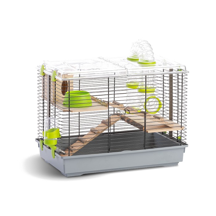 Tökéletes választás ez a teljesen felszerelt 2 szintes hörcsögketrec kis kedvence számára természetes fa lépcsővel, 2 szinten platformokkal kis házzal.