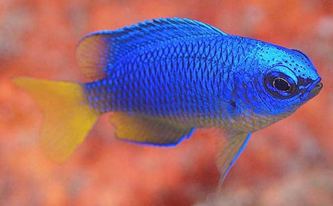 Maximális méret: 9 cm, Akvárium méret: 100 l. Kék-sárga színösszeállítású apró halacska. Viszonylag békés, nagyobb akváriumban több példány megfér egymás mellett ha van számukra elegendő búvóhely. Más fajokat sem bánt, sőt inkább az agresszívebb halak szokták passzivitásba kényszeríteni Szívós, ellenálló hal, eleségben sem válogatós. Planktonevő, bármilyen állati eredetű élelmet megeszik.