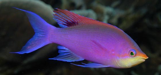 Maximális méret: 10 cm, Akvárium méret: 200 l. Színes csapathal, azonban az etetése nem könnyű. Az akváriumba egy hímből és minél több nőstényből álló csapatot telepítsünk. Ha nincs lehetőségünk sok nőstényt beszerezni, akkor jobb magában tartani. Planktonevő, a vízben lebegő húsos eleséget fogyasztja. Folyamatos táplálkozáshoz szokott, napi legalább 3-4 etetésre van szüksége. Ha nem kap változatos és jó minőségű eleséget akkor a színei sokkal fakóbbak lesznek. Nagyon kényes, nehezen eszik, a gyönyörű lilás színét is nehezen tartja meg.