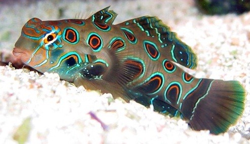 Maximális méret: 8 cm, Akvárium méret: 150 l. Gyönyörű színei és érdekes életmódja miatt kedvelt akváriumi hal. Csak jól táplált példányt vegyünk meg, a beesett hasú, lesoványodott halak sokszor menthetetlenek. Nehéz rászoktatni a mesterséges táplálékra. Segít, ha először egy kisebb, szúnyoghálóból készült, a víz tetején úszó ketrecbe kerül. Itt a táplálékot könnyen megtalálja, és ismerkedhet vele a többi hal zavaró hatása nélkül. Amikor már stabilan eszik, akkor engedjük csak be az akváriumba. Másik zavaró szokása, hogy minden egyes falatot alaposan megvizsgál mielőtt bekapná. Ezért a többi hal általában eleszi előle az ételt. Segít a problémán egy etető edény: egy akkora szájú üvegedény, amibe csak a mandarinhal fér be.