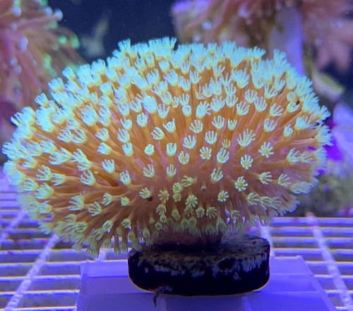 Szép színű, ritka korall, de a nemzetsége többi fajától eltérően a tartása nem egyszerű. Sok fényt igényel hogy az élénk sárga színe megmaradjon. A mechanikai sérülésekre is érzékenyebb, egy erősebb megfogás is nyomot hagyhat rajta. Etetni nem kell. Időnként vedleni szokott, amikor héhány napra becsukódik, majd egy vékony hártyát választ le magáról. Így szabadul meg a felszínére tapadt algától és üledéktől. A gyakori (havonkéntinél sűrűbb) vedlés valami problémára utal. Ha a leváló hártya 1-2 napnál tovább a korallon marad az túlságosan kevés áramlásra utal. Érdemes óvatosan segíteni a hártya legyezésével vagy óvatos letörlésével.