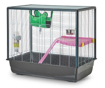 A ketrec kiváló minőségű, színes kiegészítőkkel kapható: egy, a ketrec oldalára akasztható acéltállal, egy műanyag vizes palackkal (500 ml), és egy világos rózsaszín, mászólétrás sarokplatformmal. A ketrec tartalmaz egy zöld nylonból készült függőágyat, puha fekete polár béléssel, amely tökéletes a kényelmes szunyókálásra.