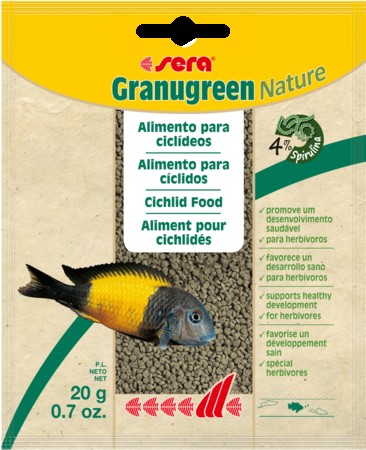 Zöld granulátum táplálék növényevő Malawi-és Tanganyika-tavi cichlidák számára. A sera granugreen magas részarányú karotinban gazdag spirulina algákat tartalmaz és ezzel elősegíti e gyönyörű díszhalak pompás színeit.