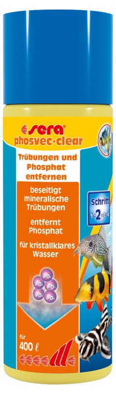 Megköti a vízben oldott foszfátot (PO4) azonnal és tartósan. A megkötött foszfátot (látható zavarosodás képződik) az akváriumszűrő segítségével vagy a sera aljzattisztítóval távolítsuk el a vízből.