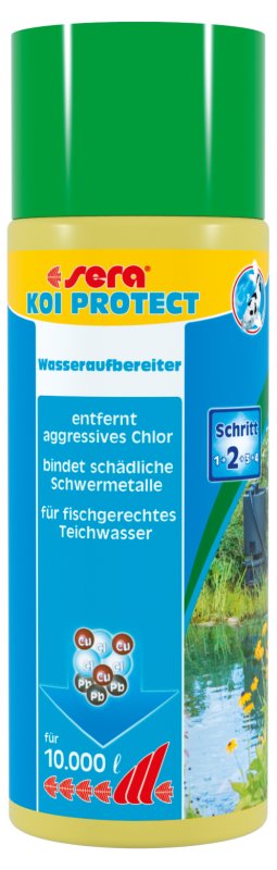 A sera KOI PROTECT kolloidokkal és vitaminokkal gondoskodik az Önök értékes koi-pontyai és más igényes hidegvízi kerti tavi halai nyálkahártyájának-védelméről. A sera KOI PROTECT azonnal megköti a káros fémkötéseket. Semlegesíti a kioldott sókat és az agresszív klórt. Ezen felül a sera KOI PROTECT megköti az úszó algákat és egyéb szennyeződéseket a vízben. Az Ön koi-tava mindig kristálytiszta marad.