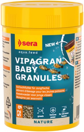 Granulátumtáplálék növendékhalak és kisszájú fajok számára. Az apró magméret miatt a sera vipagran baby ideális a kis pontylazacok és a márnák, botiák, törpe tarkasügérek és kis labirintushalak számára.