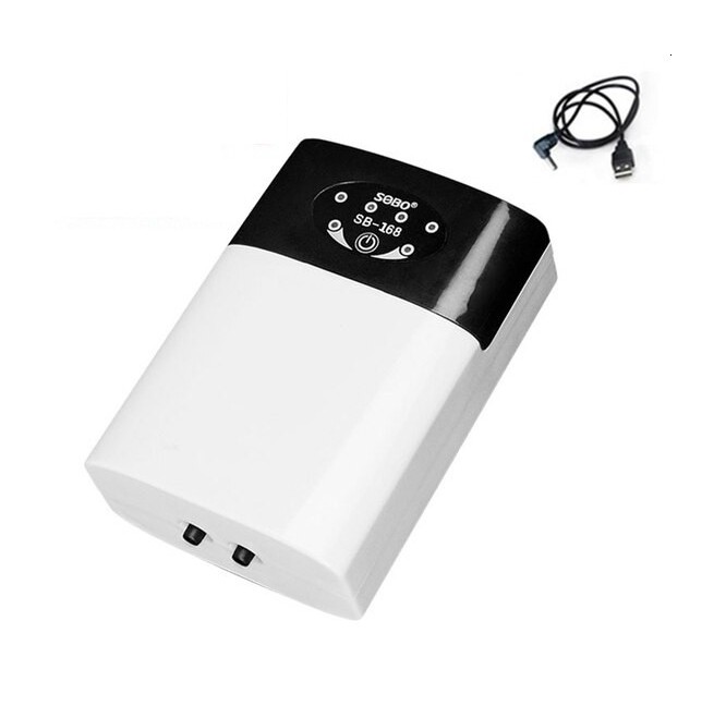 SOBO akkumulátoros levegőpumpa akvárium levegőztetéséhez, vagy halak szállításához, ideiglenes oxigénellátásához. Feltöltött állapotban akár 120 órás üzemidőre is képes a takarékos üzemmódnak köszönhetően. Jól látható LED indikátorok jelzik a töltöttségi szintet, az üzemmódot, vagy épp a töltés folyamatát. Egy gombnyomással válthatunk a folyamatos, takarékos (10 másodperces szakaszos működés) és alvó üzemmód között. USB csatlakozójával bármilyen mobiltelefonos töltővel vagy szivargyújtó csatlakozóval használható, tölthető. A csomag tartalmaz levegőcsövet, porlasztót és USB kábelt (NEM tartalmaz töltőt és szivargyújtó csatlakozót). A levegőpumpán akasztó található, amivel pl. a halszállító vödörre akaszthatjuk.