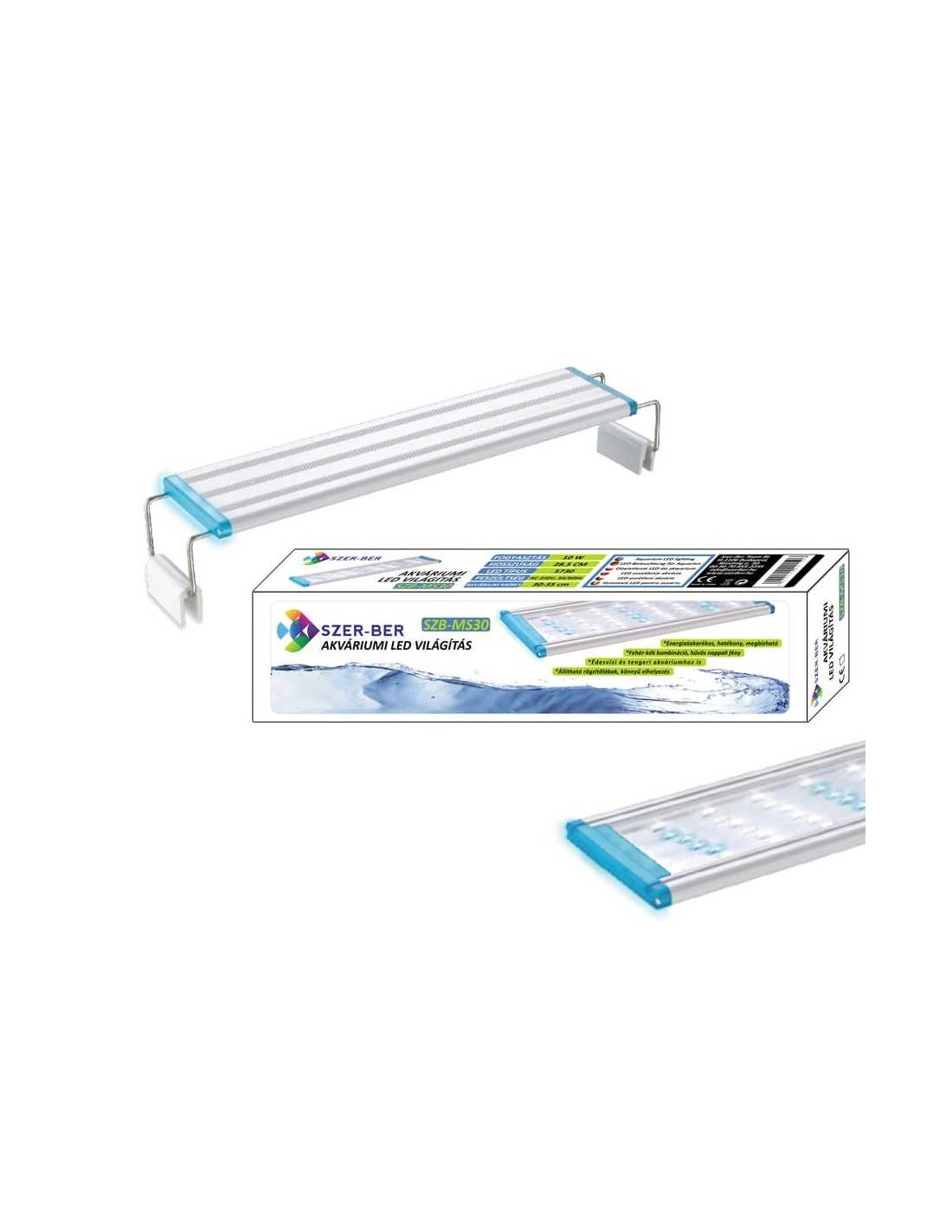 Szer-Ber akváriumi LED világítás nyitott tetejű vagy üvegtetős akváriumra. Teljes értékű nappali fényt biztosít akváriumunknak, látványosan kiemelve annak élővilágát és környezetét. A fehér és kék fényű LED izzók kombinációja élénk hűvösfehér fényhatást kelt, színspektruma és intenzitása ideális vízinövények és díszhalak, akváriumi állatok számára, bármilyen éghajlatról származzanak is. A LED technológia hatékony és energiatakarékos, hosszú távon biztosítja az ideális fényeket akváriumunknak. A lámpatest minőségi alumínium alapanyaga jó hővezető tulajdonsággal bír, ezzel elkerülve a túlmelegedés kockázatát. Teleszkópos lábait egyszerűen az akváriumunk méretéhez igazíthatjuk, és könnyen elhelyezhetjük velük a lámpát az akvárium falain rögzítve. Modern külalakja által mutatós kiegészítője az akváriumnak bármilyen stílusú helyiségben. Minőségi, megbízható fényforrás, kedvező áron.