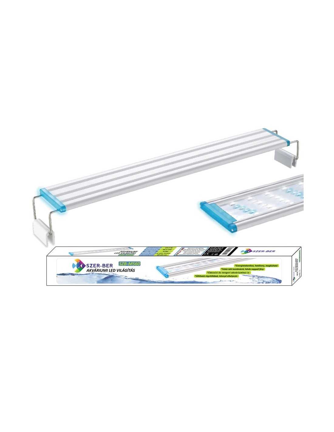 Szer-Ber akváriumi LED világítás nyitott tetejű vagy üvegtetős akváriumra. Teljes értékű nappali fényt biztosít akváriumunknak, látványosan kiemelve annak élővilágát és környezetét. A fehér és kék fényű LED izzók kombinációja élénk hűvösfehér fényhatást kelt, színspektruma és intenzitása ideális vízinövények és díszhalak, akváriumi állatok számára, bármilyen éghajlatról származzanak is. A LED technológia hatékony és energiatakarékos, hosszú távon biztosítja az ideális fényeket akváriumunknak. A lámpatest minőségi alumínium alapanyaga jó hővezető tulajdonsággal bír, ezzel elkerülve a túlmelegedés kockázatát. Teleszkópos lábait egyszerűen az akváriumunk méretéhez igazíthatjuk, és könnyen elhelyezhetjük velük a lámpát az akvárium falain rögzítve. Modern külalakja által mutatós kiegészítője az akváriumnak bármilyen stílusú helyiségben. Minőségi, megbízható fényforrás, kedvező áron.