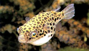 * Tudományos név : Tetraodon fluviatilis * Magyar név: Zöld gömbhal * Csoport: Brakkvizi halak * Származás: Délkelet-Ázsia. * Testhossz: 15 cm * Természetes élőhely: Édesvizek, brakkvizek és folyamtorkolatok. * Viselkedés: Míg fiatal, békés, idősebb korára agresszív. * Táplálkozás: Mindenevő, de főleg a csigákat részesíti előnyben. * Szaporítás: Nehéz * Medence: Minimum 200 literes * Halnépesség: 200 literre 4 hal * Dekoráció: Kövek, növények, korallvázak. * Hőmérséklet: 24-28 °C * pH: 7,5-8 * Keménység: 11-20NK° * Sótartalom: 2-5% Megjegyzés: A Tetraodon fluviatilis brakkvízhen szaporodik, a tengervizet nem viseli el. Mivel felnőtt példányai nagyon agresszívak, inkább specifikus akváriumban érdemes tartani. A zöld gőmbhalnak is megvan a családjára (Tetraodontidae, azaz a Négyfogúak) jellemző képessége: ha veszélybe kerül, fölfújja magát vízzel. Erős és félelmetes fogai vannak, s ezekre szüksége is van, különben nem tudná feltörni velük kedvenc csemegéjét, a csigát. Ha azt akajuk, hogy jól érezze magát, nekünk is csigával kell etetnünk (amit egy elkülönített helyen magunk is tenyészthetünk), ezenkívül kaphat még rákot és zöldféléket is. Szaporodás idején a pár látványos násztáncot lejt, s a nőstény egy kőre helyezi az ikrákat, melyeket azután a hím őriz. Amikor az ivadékok már úszni kezdenek, etessük őket kerekesférgekkel. Az adatok a diszhal.info honlapról származnak.
